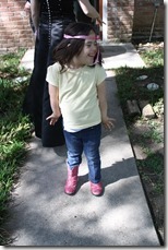Joy was enthralled by it all. She put the ribbon from the flowers on her head and then went and found a stick to carry around. She was just like Becca!