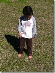 My cute boy – playing outside, barefoot! He was exploring the grass and following my voice in the last two pictures. I’m so proud of him.